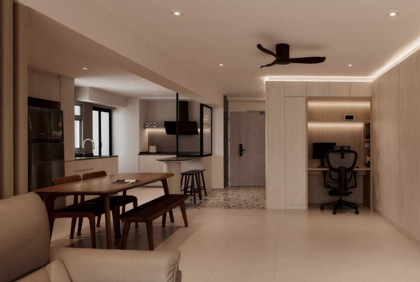 One of the most effective ways to make a 3-room HDB feel larger is by adopting an open-concept layout. Tearing down non-structural walls can unify your living, dining, and kitchen areas, creating a sense of flow and openness.
